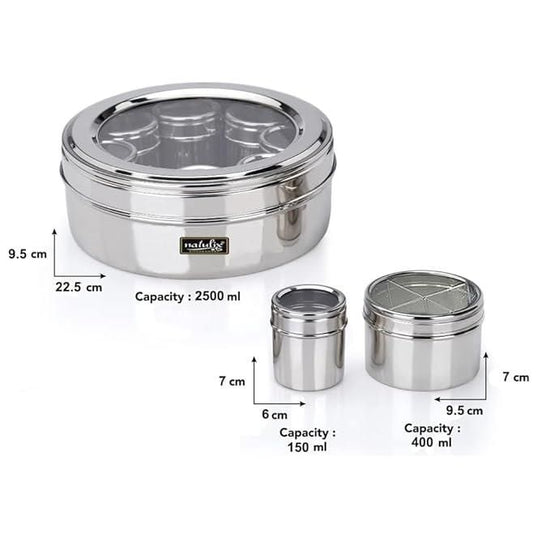 Product Description: 12 in 1 Stainless Steel Masala Box (9.5*22.5cm) Package Contains: It has 1 Piece of Masala Box Material: Stainless Steel Dimension: (9.5x22.5cm) Capacity: 2500ml Weight: 680gm