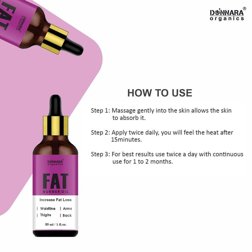 Product Name: Donnara Organics Premium Fat Loss Oil - A Belly fat reduce oil/ weight loss massage oil/ fat burner oil for women/ slimming oil Combo Pack Of 2, 30ml (60ml) Package Contains: It Has 2 Piece of Fat Loss Oil Composition: Liquid Product Quantity: 60ml Skin Type: All Skin Type Form: Liquid Combo: Pack of 2 Ideal for: Women Weight: 60