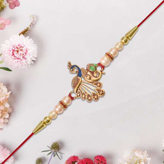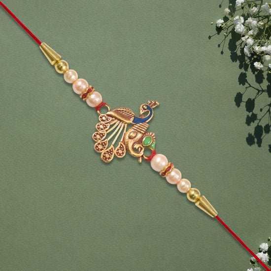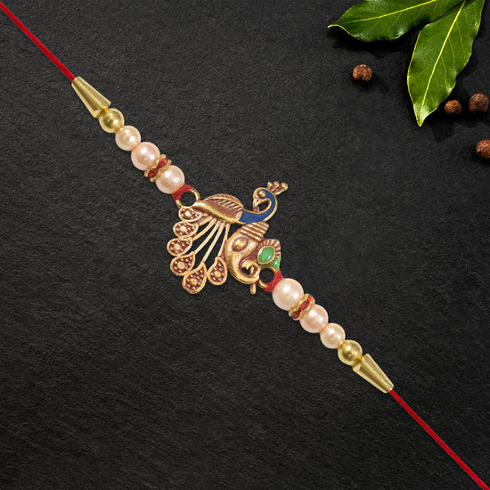Type: Elegant Peacock Design Rakhi With Pearl Beads And Golden Detailing On Red Thread