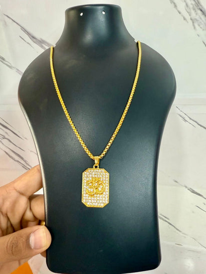 Product Name: Gold Plated Om Diamond Pendant and Chain Package Contains: It has 1 Chains With Pendant Material: Alloy Size: Free Size Occasion: Casual Combo: Pack of 1 Ideal for: Men Weight: 250 gm