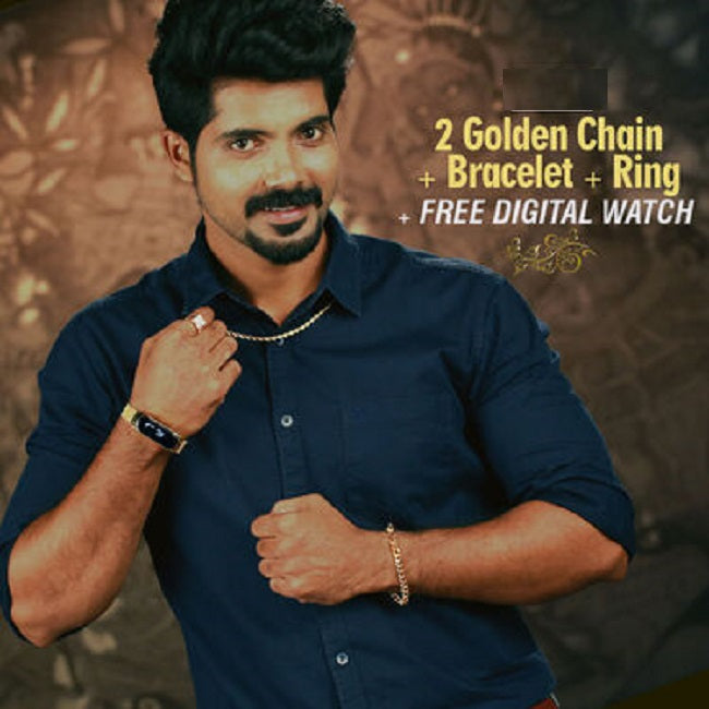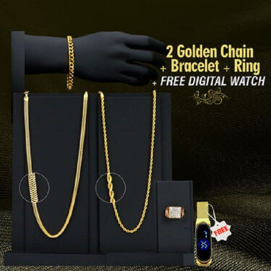 Product Name: Pack Of 2 Golden Chain With Golden Bracelet And Diamond Ring + Free Digital Watch Combo Package Contains: Combo Items Material: Others Color: Colour as per availability Additional Information: There is no better choice than this combination comprising of 2 Golden Chains + Bracelet + Ring with Free Digital Watch . If you're seeking for a special gift for your loved ones throughout the wedding season, These accessories have the appearance of real jewellery and are finished in a top quality, long-lasting golden finish. They are appropriate for regular wear, formal occasions, weddings, and even parties as well. Weight: 200