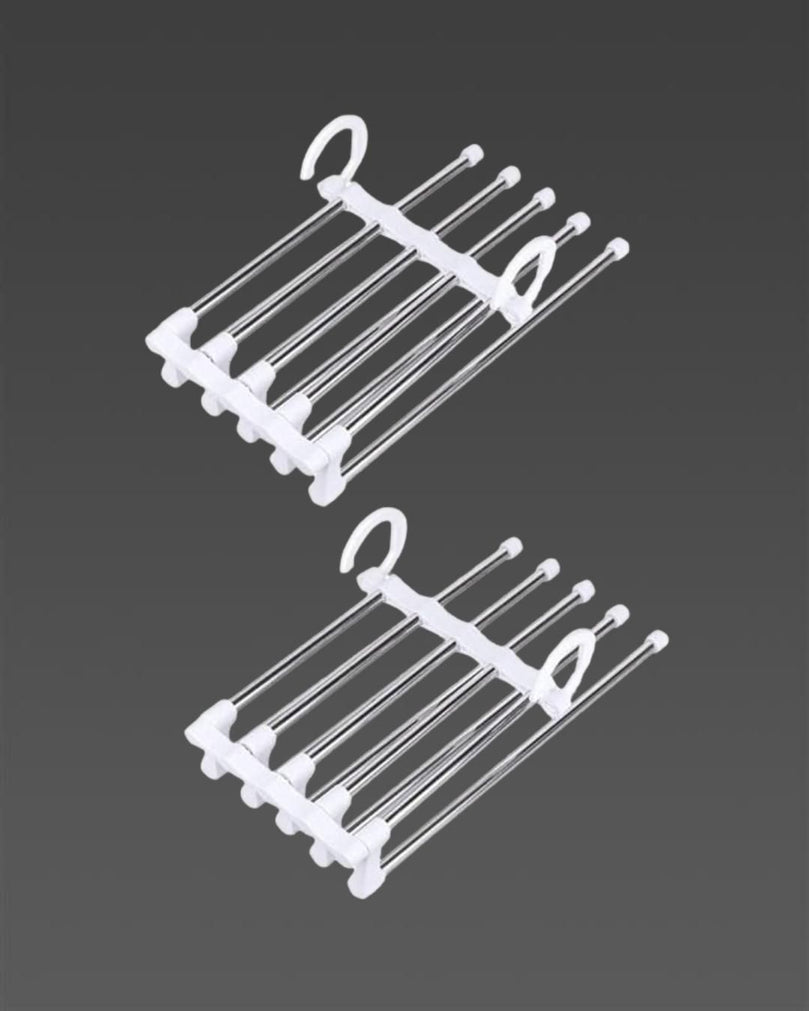 Product Description: 5 In 1 Stainless Steel Multifunction Retractable Pants Rack Trouser Hanger Storage Organizer for Clothes, Skirt, Pants Package Contains: It has 2 Piece of Hanger Product Dimensions (L X W X H in cm): 34 X 16.8 X 12.5 Features: -Multi-function hangers with 360 ° rotating hook, perfect for keeping scarves, shawls, belts, tie etc. -Two hooks on the top. You can use both two hooks for horizontal hanging or you can only use one hook for vertical hanging -With five stainless steel tubes, each tube can be pulled outward for convenient hanging and fetching. -It's easy to carry. When you travel, just roll your pants around the trousers rack and put them in the bag. There are two hooks that can be hung on the cross bar in the closet. There are five small rods below. Each small rod can hold 1-4 trousers, 5-20 trousers totally.