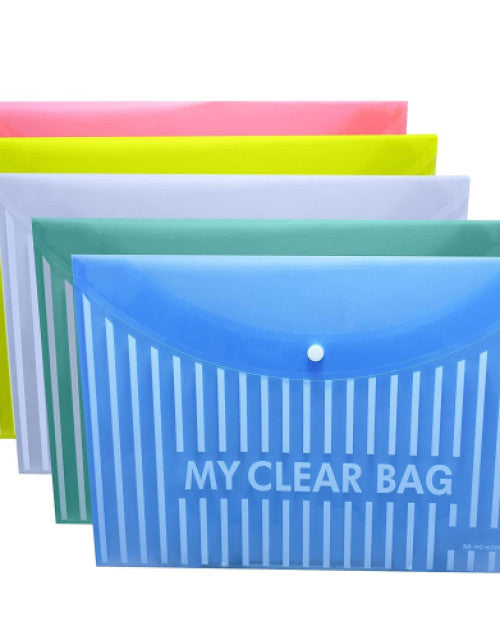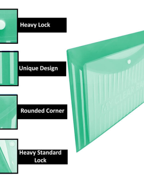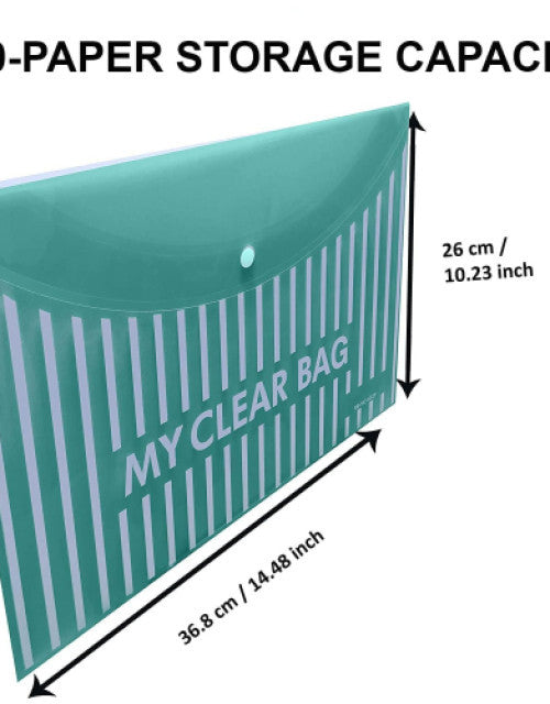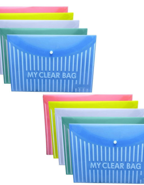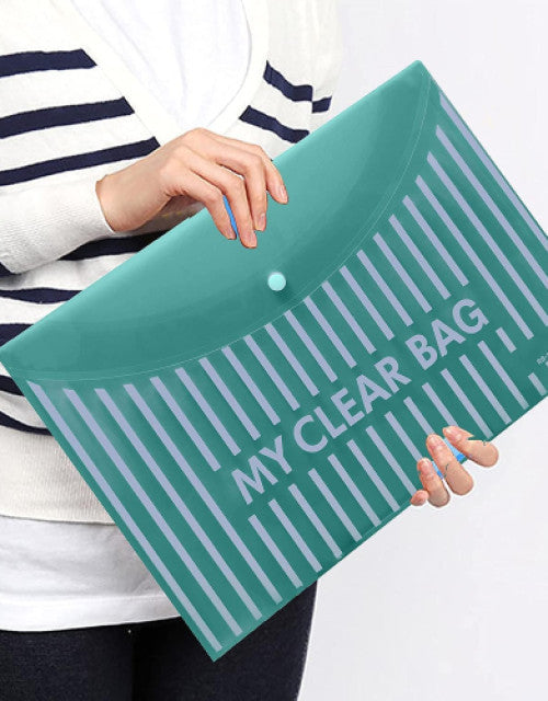 Type: Heavy Plastic 300 Micron Clear Envelopes with Snap Button Closure - A4 & Legal Letter Size - Lining Print Plastic Poly Document File Folder for School, Home & Office Use - Pack of 10