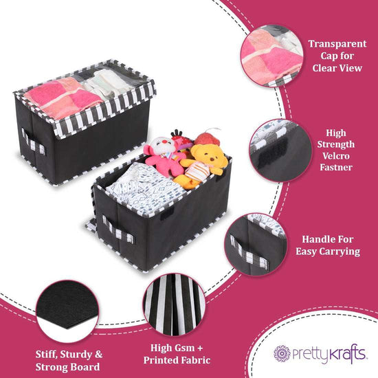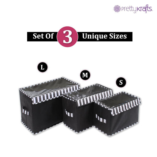 Product Description: Multi-Purpose Collapsible Storage Organizer with Transparent Lid Package Contains: It has 3 Piece of Storage Box Organizer Material: Fabric Product Dimension(L X W X H in inch): Small: 13 x 7 x 8, Medium: 15 x 8 x10, Large: 18 x 10 x 11 Product Weight: 350 gm Features: -Fabric Bins are made with cardboard, which is soft and breathable, protecting both your hands and your items. -This definitely helps you keep your stuff neatly in the storage bin which makes your home/office keep away from clutter. -This Clothes Organizer offers complete protection from dust, moths, moisture. -The Cloth bag can be kept in your storage beds, closets, wardrobes, storage cabinets. -Use it as saree cover, blanket cover bag, toy box storage for kids, a closet organizer for clothes, dorm-room storage, garments organizer, saree organizer in closet, etc. -It maximizes your storage space and is perfect for those not-so-frequently used items in your household. -These organizers for clothes can be folded back when not in use. It collapses flat for saving precious storage space.