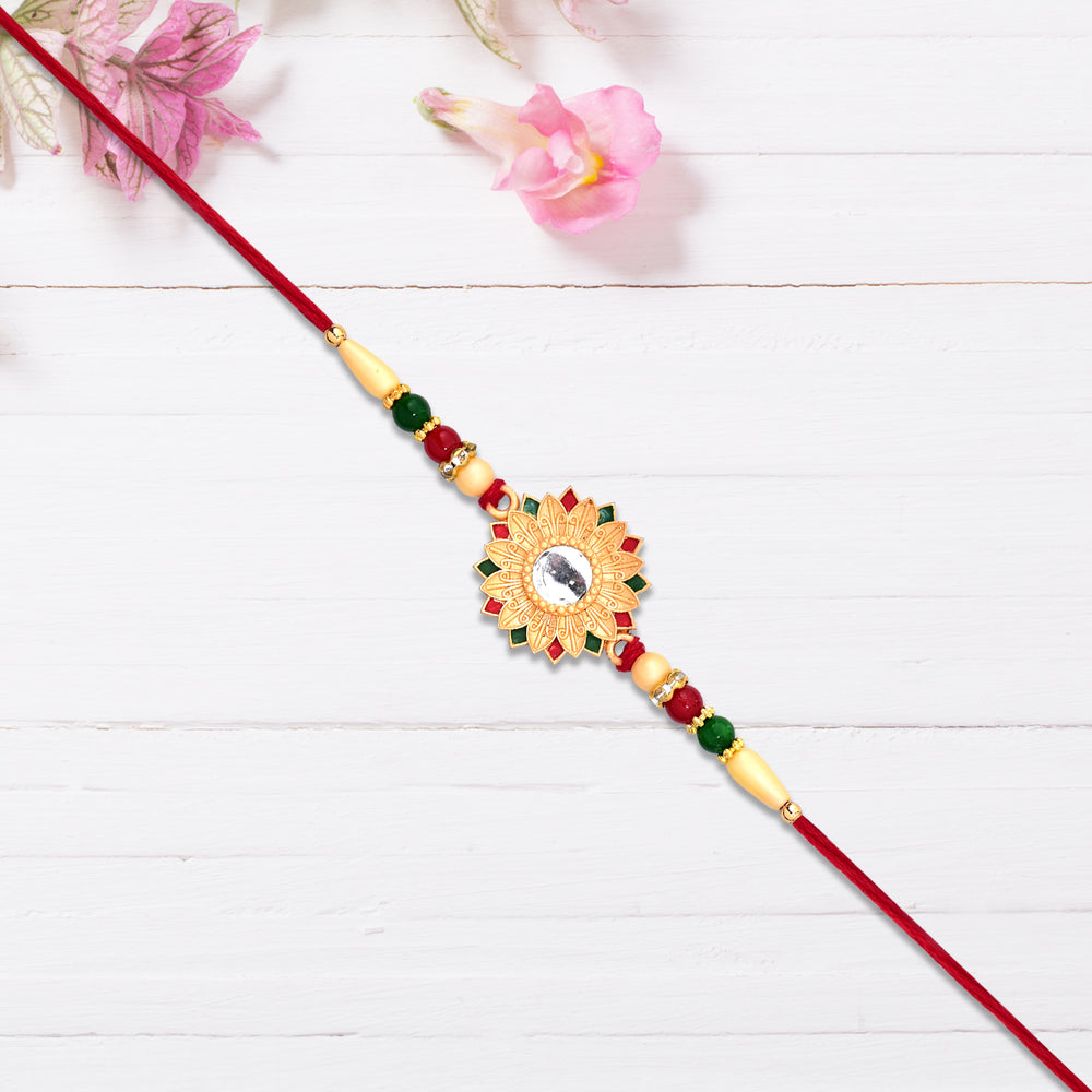Honor the timeless bond between siblings with our intricately designed Rakhi. Crafted with care and elegance, this Rakhi blends traditional charm with modern aesthetics. Whether you're near or far, send your love and blessings with this exquisite thread of affection.