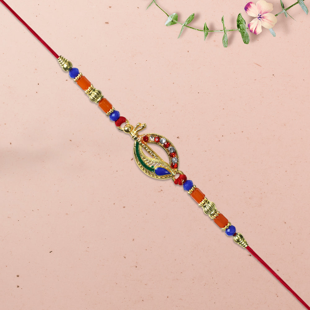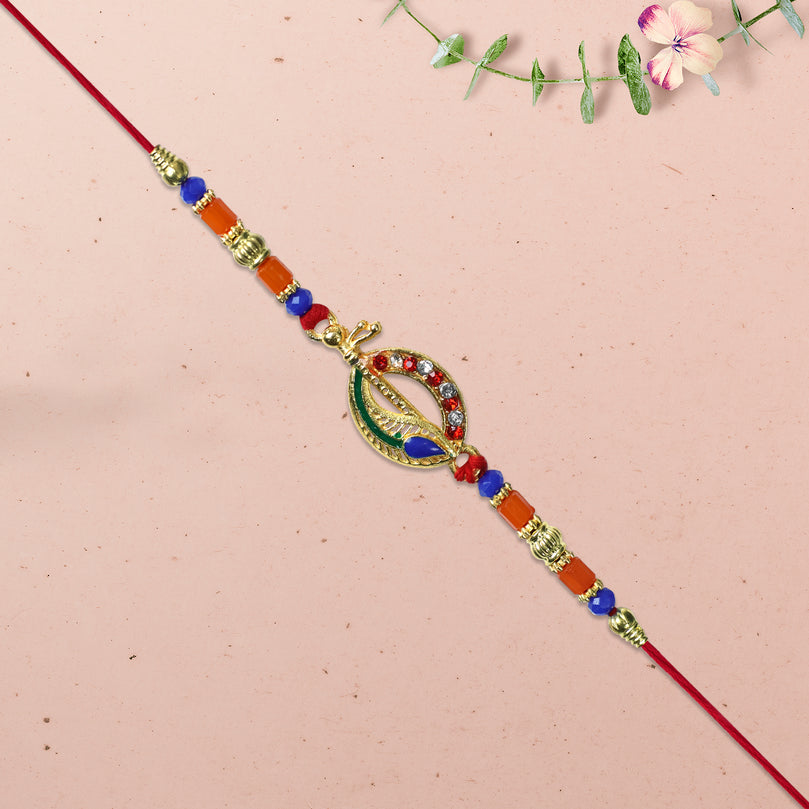 Honor the timeless bond between siblings with our intricately designed Rakhi. Crafted with care and elegance, this Rakhi blends traditional charm with modern aesthetics. Whether you're near or far, send your love and blessings with this exquisite thread of affection.