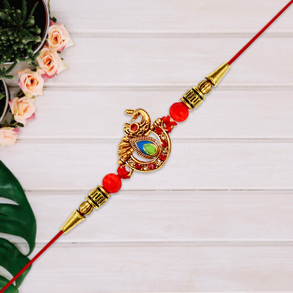 Honor the timeless bond between siblings with our intricately designed Rakhi. Crafted with care and elegance, this Rakhi blends traditional charm with modern aesthetics. Whether you're near or far, send your love and blessings with this exquisite thread of affection.