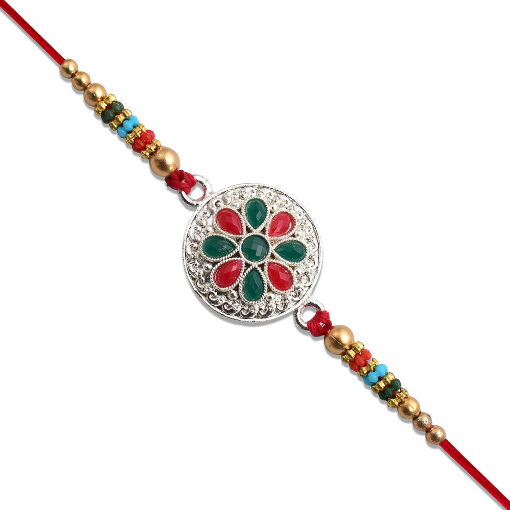 Silver Plated Floral Rakhi With Red Green Stones
