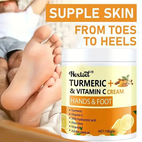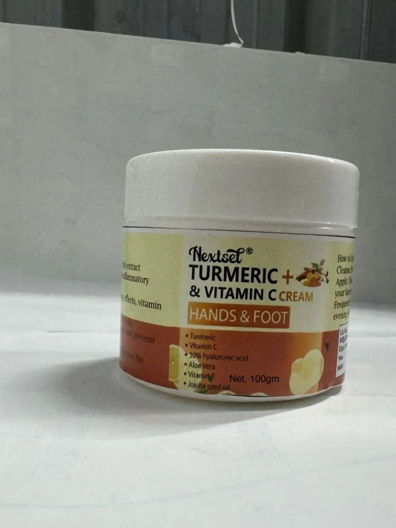 Product Name: Turmeric & Vitamin C Hand and Foot Cream 250g Package Contains: it has 1 Piece of Hand and Foot Cream Composition: Glycerin, Vit C, Hyaluronic Acid, Aloe Vera, Jojoba Oil Product Quantity: 250g Skin Type: All Skin Type Form: Cream Combo: Pack of 1 Ideal for: Men & Women Weight: 300
